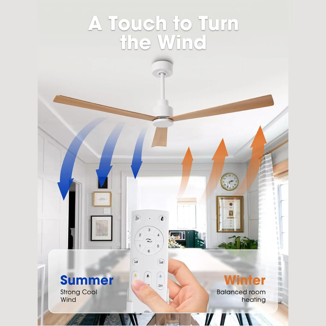 En été, ses pales tournent dans le sens de l’horloge pour diffuser une brise rafraîchissante. En hiver, elles pivotent en sens inverse afin de redistribuer l’air chaud accumulé au plafond, améliorant ainsi le confort thermique et réduisant la consommation énergétique.